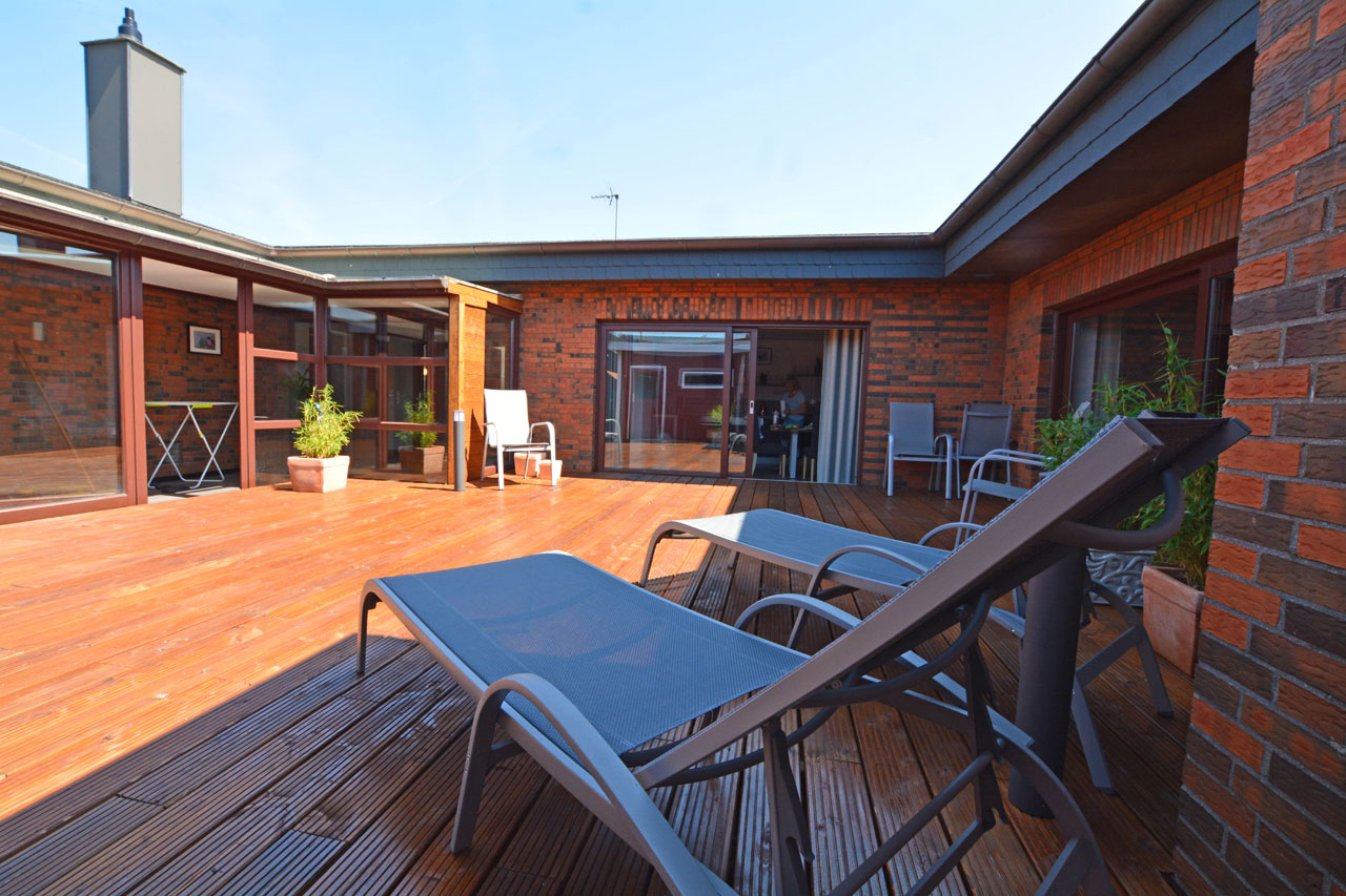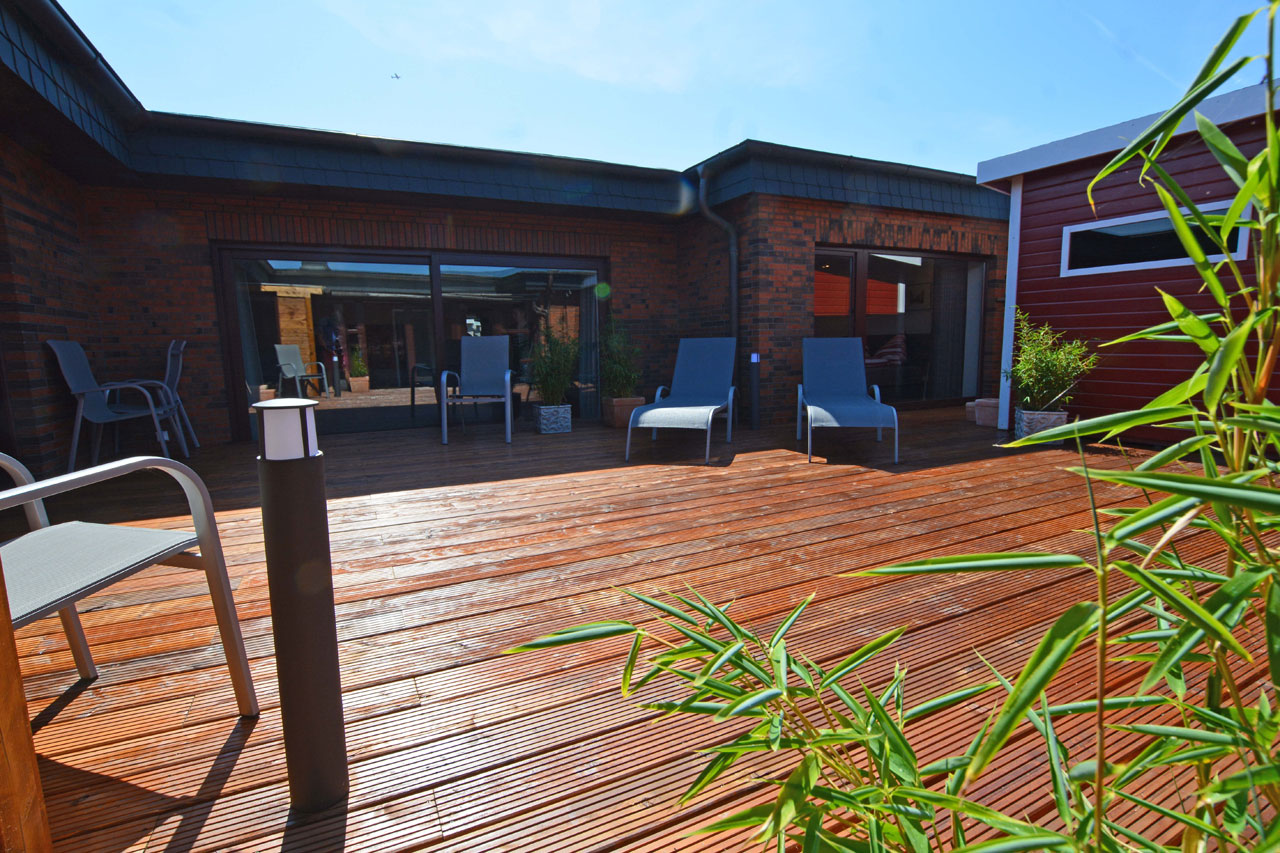 Wir bieten Ihnen ein geräumiges Ferienhaus für bis zu sechs Personen. Inklusive Sauna und nicht einsehbarem Atrium-Innenbereich für den ungestörten Aufenthalt.